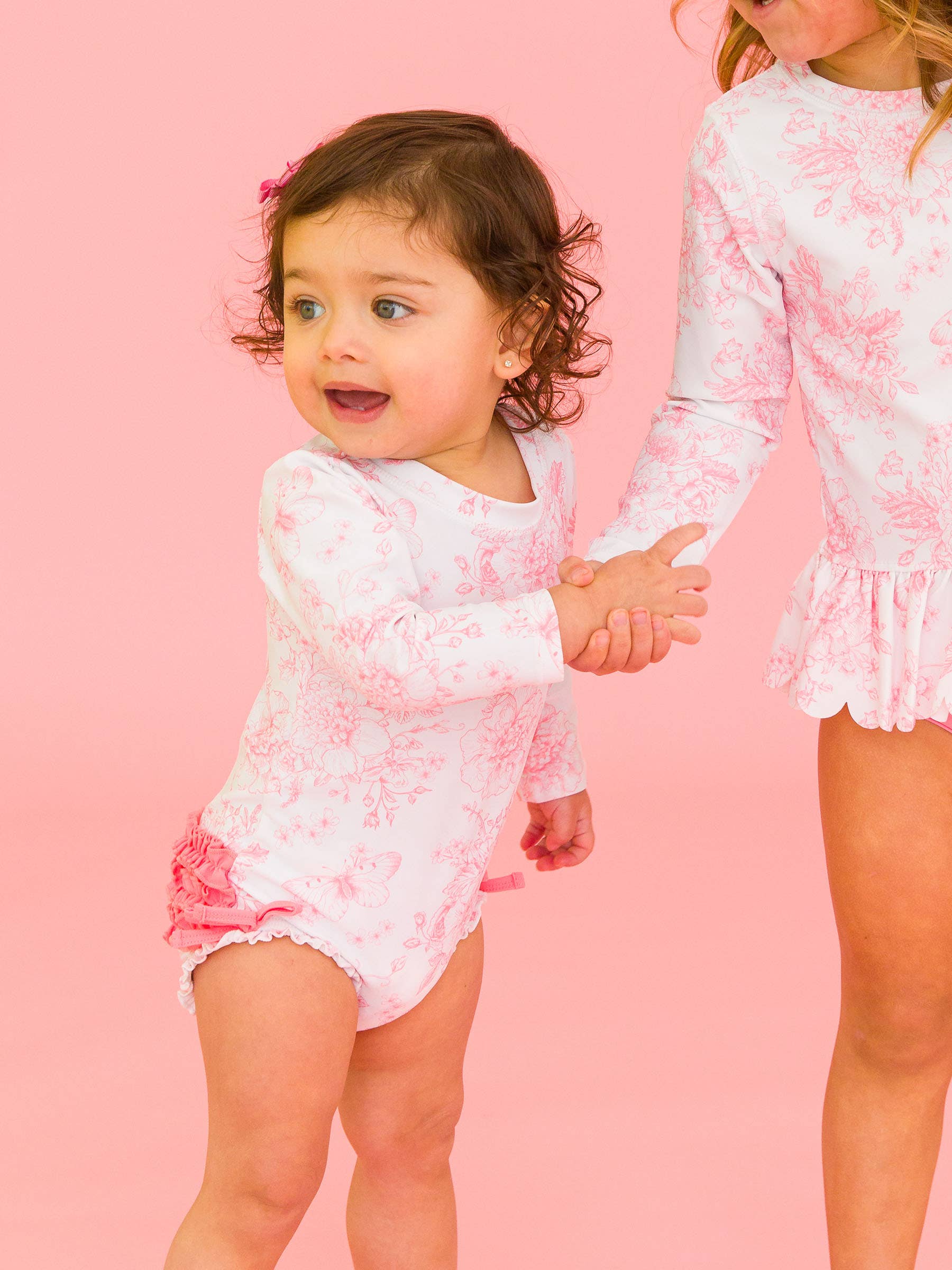 Baby Girls Bubblegum Pink Butterfly Garden Toile Long Sleeve One Piece Rash Guard Swimsuit with Signature Rear Ruffles