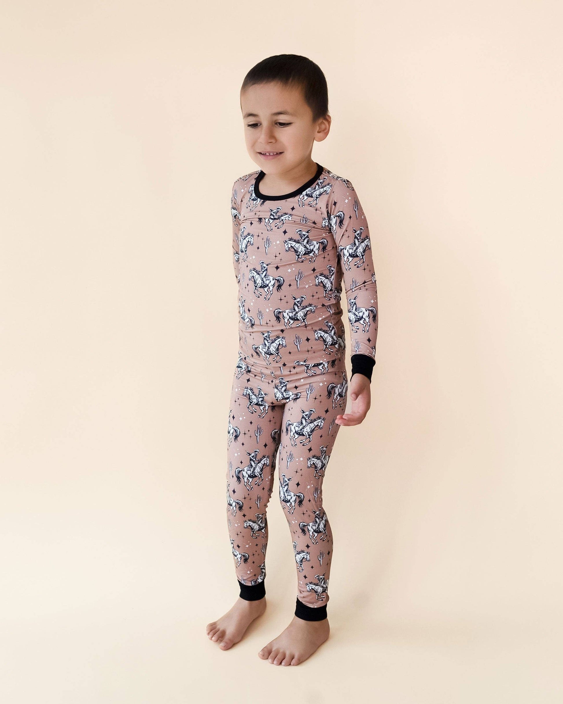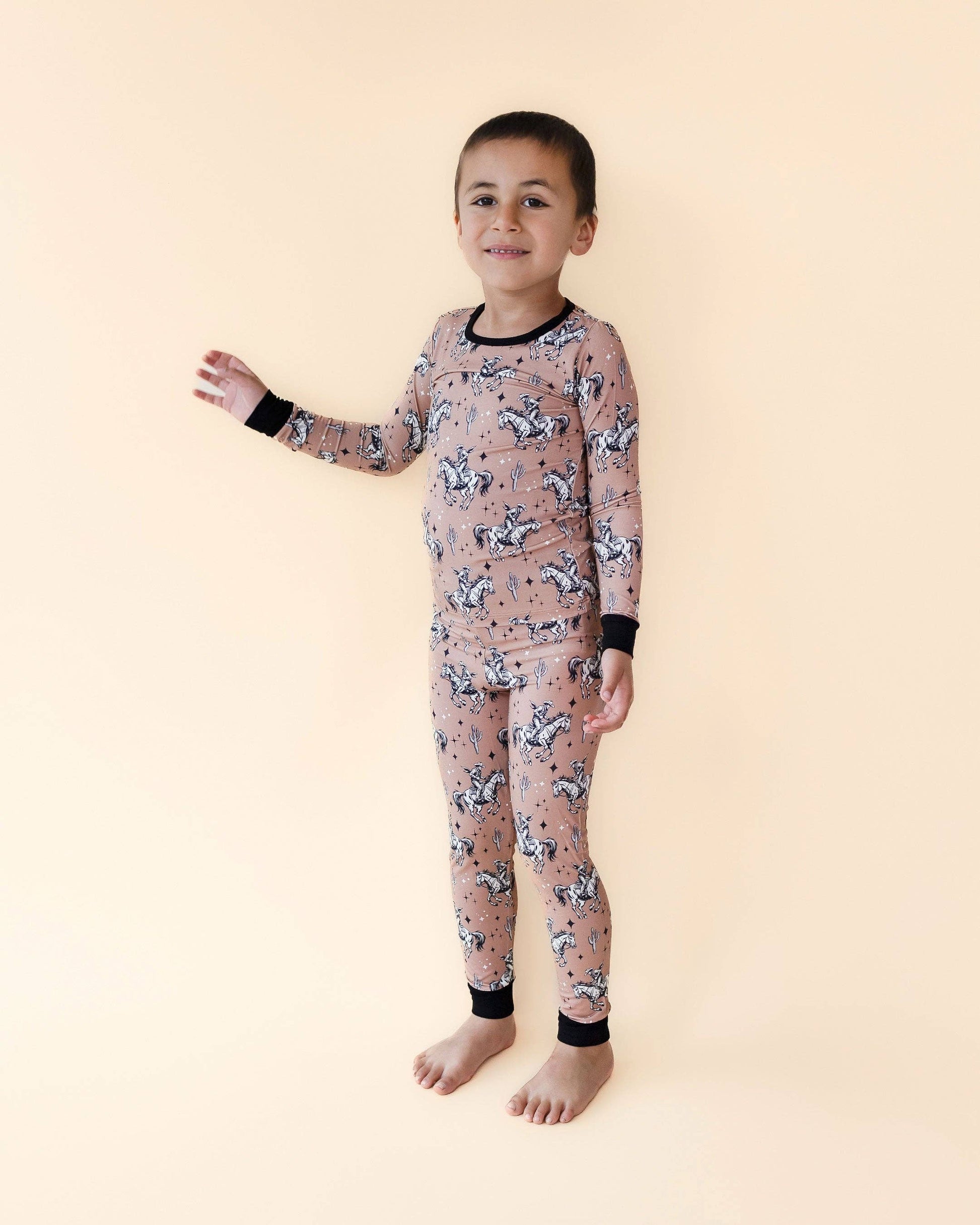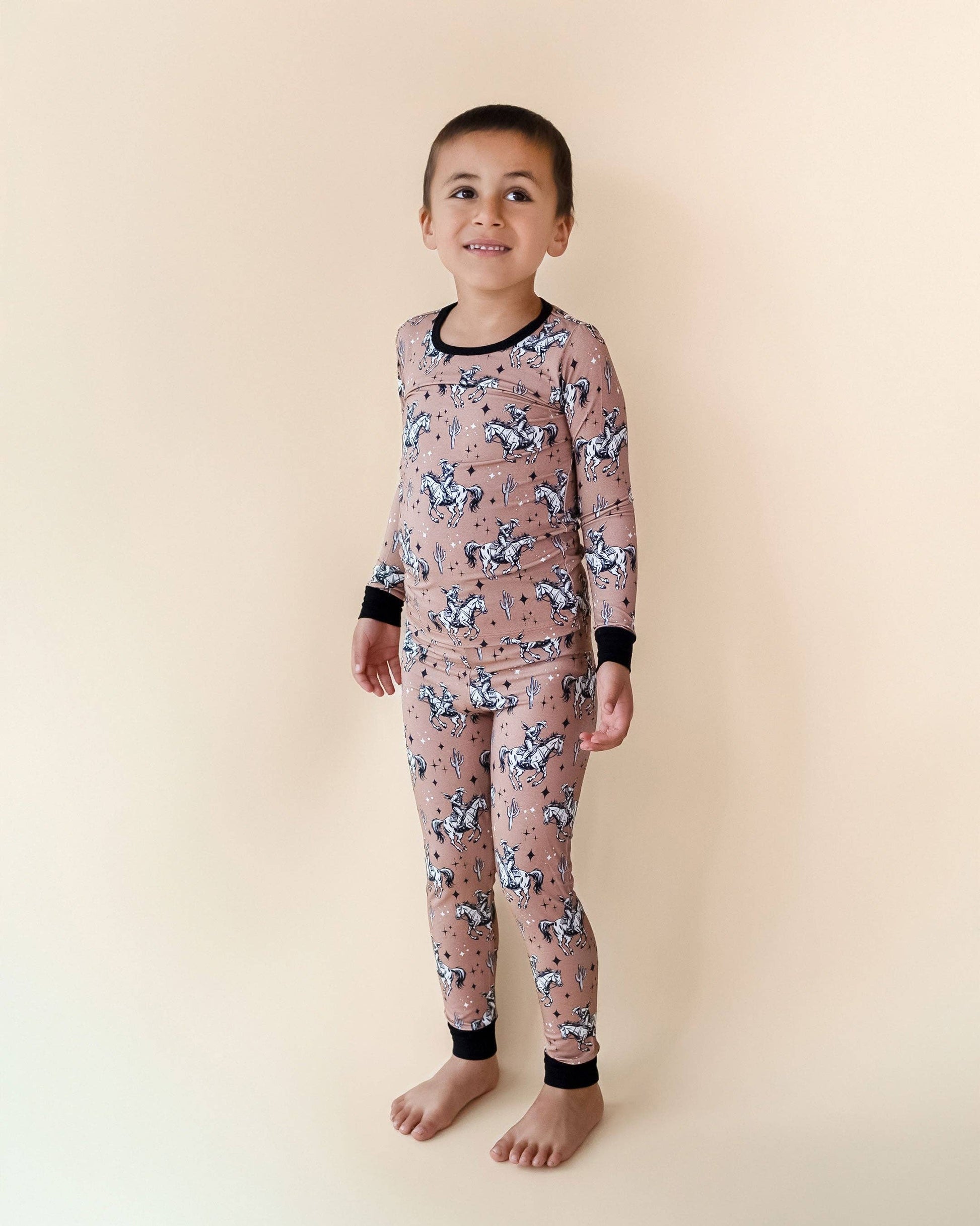 Saddle up! Your little one will adore our Bamboo Two-Piece Set | Desert Cowboy Cutie! Featuring a modern vintage print with a cowboy on horseback, cactuses, and stars, this set is perfect for playtime, photos, and everything in between. Made from a bamboo viscose and spandex blend, it’s soft, stretchy, and oh-so-comfy for your little adventurer. Whether they’re exploring the desert or posing for a family photo, this set is ready for the ride! Available in sizes 18-24M to 9Y, it’s designed for bigger cowgirls and cowboys ready to show off their unique style.
