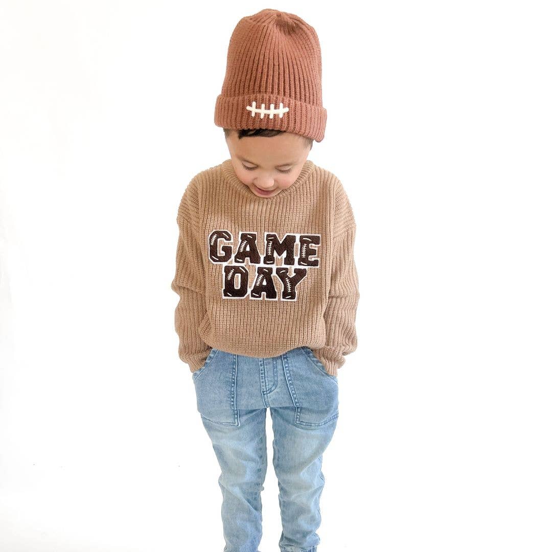 The Football Lace Patch Beanie for kids is a fun and cute accessory for celebrating Game Day!