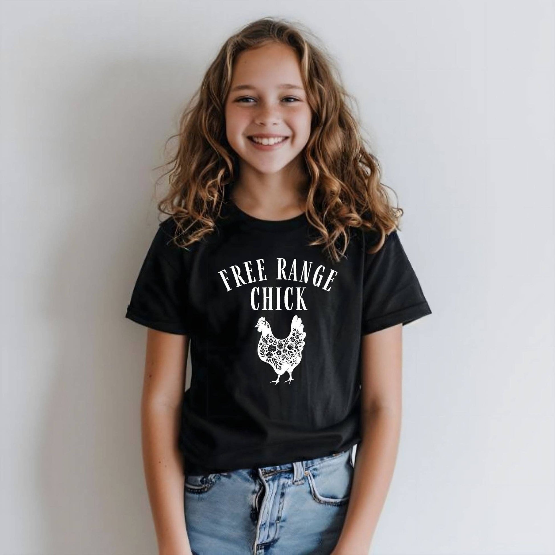 This youth t-shirt features a unique "Free Range Chick" design with a charming floral chicken. Made for kids, its soft fabric and durable construction provide comfort and style. Encourage individuality and sustainable farming practices with this fun and eco-friendly shirt.