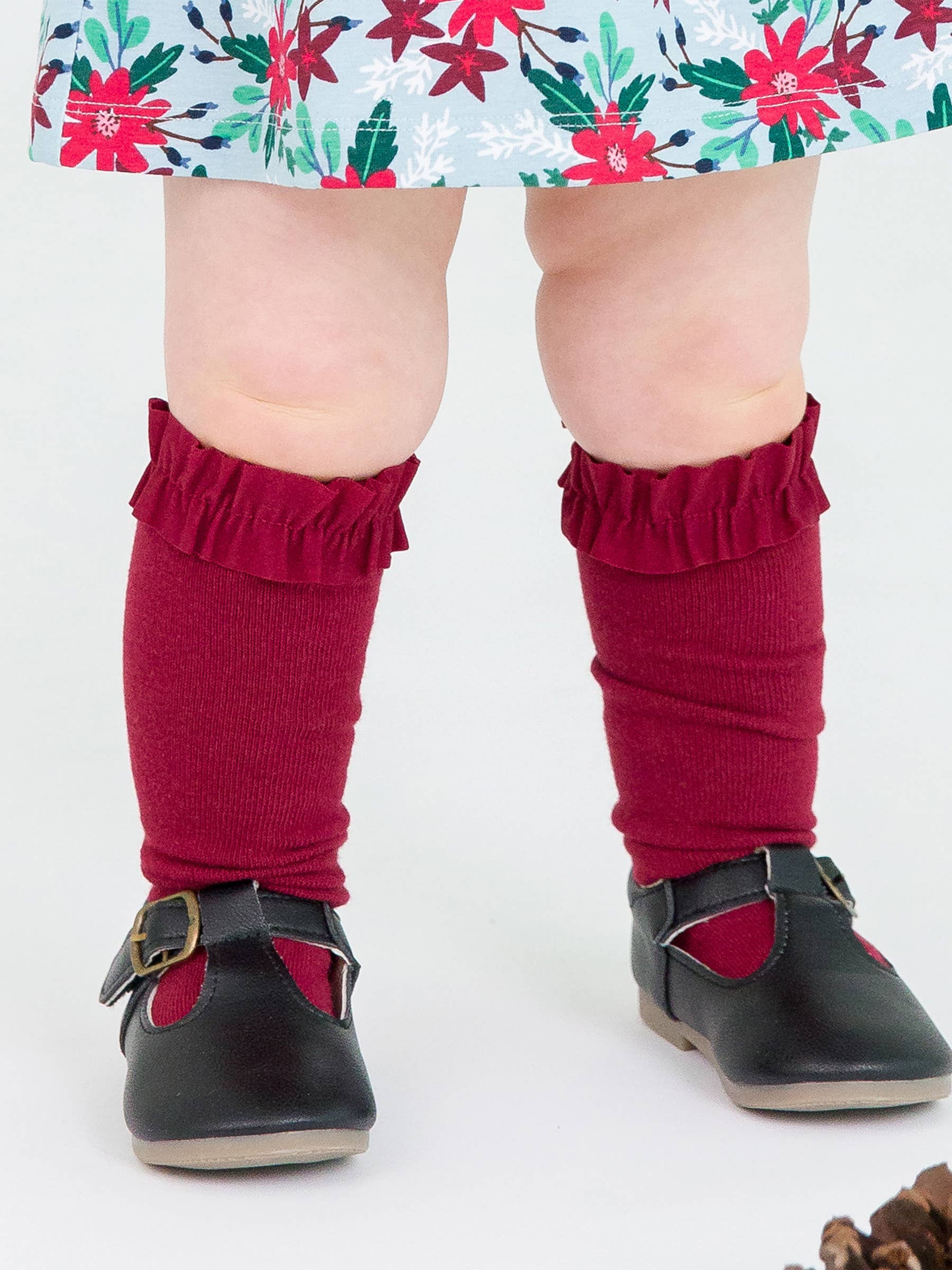 Girls Dark Cherry, White & Fir Green 3-Pack Knee High Ruffle Socks