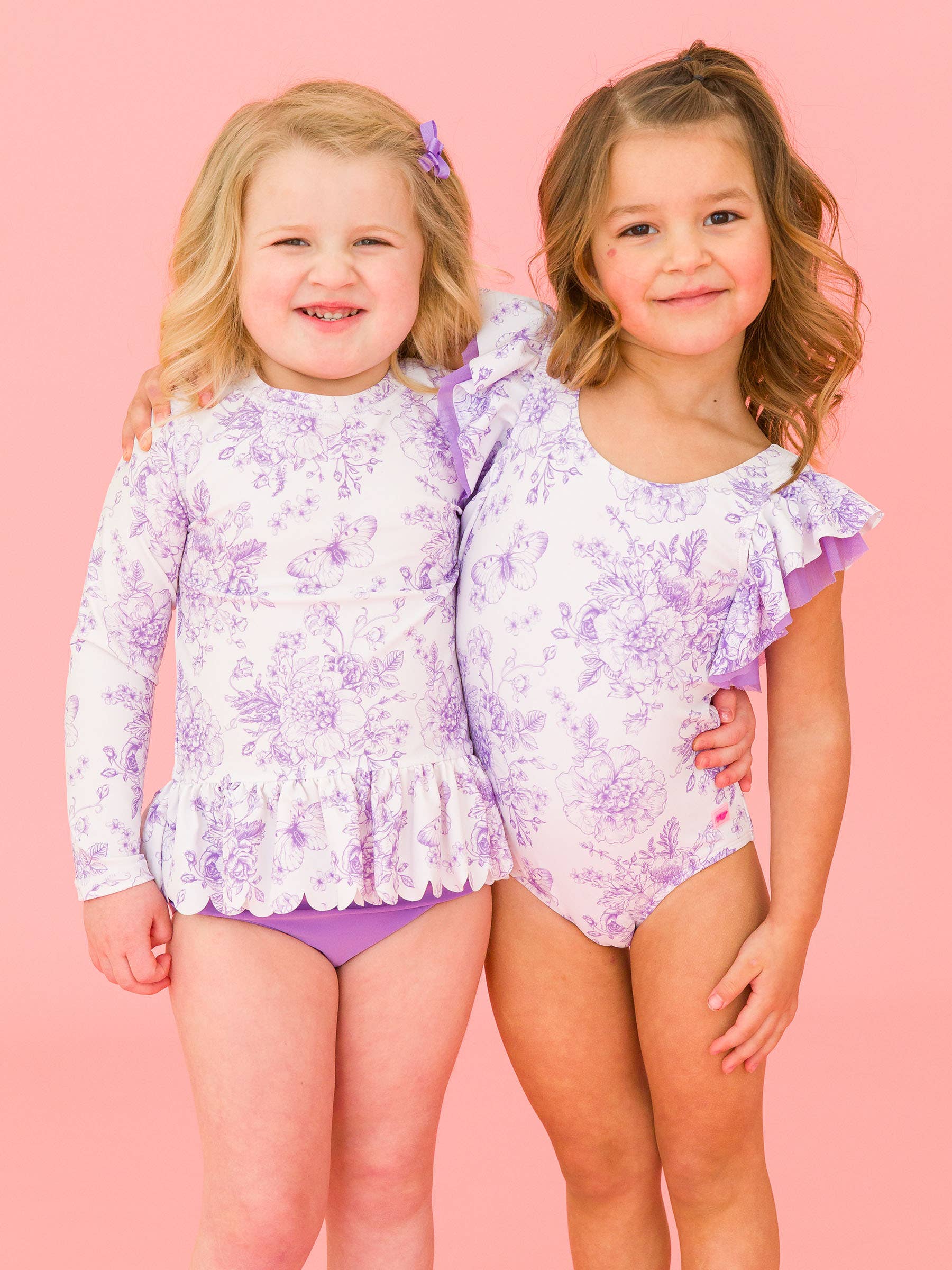 Girls Wisteria Purple Butterfly Garden Toile Butterfly Sleeve One Piece Swimsuit