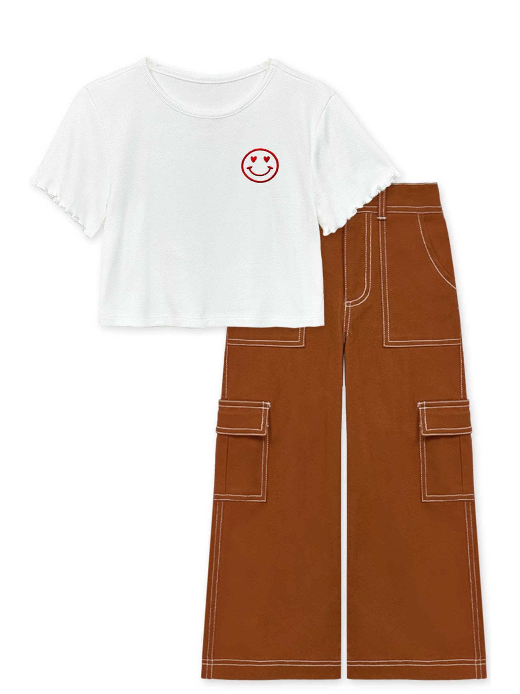 Girl's 2 pc Top & Pant Set w/ Happy Face Embroidery